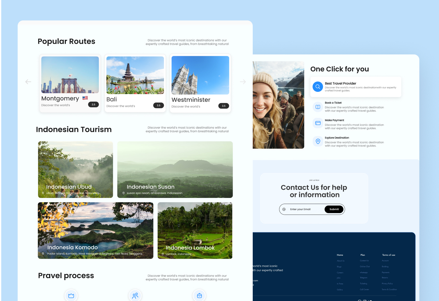 Designed a modern, conversion-focused landing page for a tour booking travel agency website. The UI/UX emphasizes stunning destination visuals, clear package details, to inspire travelers and simplify bookings.